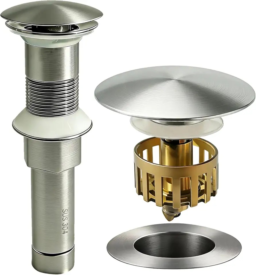 SUS 304 stainless steel pop-up sink drain without overflow fits vessel sinks with brushed nickel finish for modern bathrooms. Strainer plug catches debris; easy pop-up mechanism. Rust-resistant and durable – simple install and reliable performance for clean, stylish drainage.